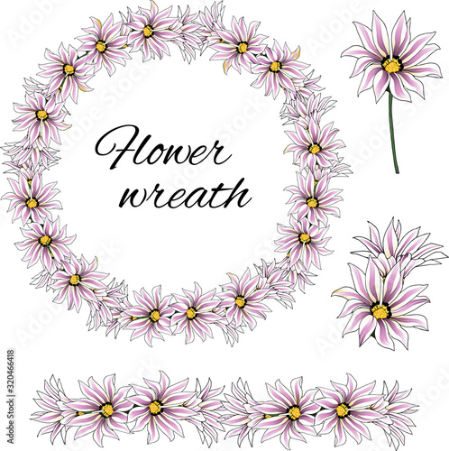 Spring pink flowers, set of african daisy wreath. Realistic vector illustration cut to white.