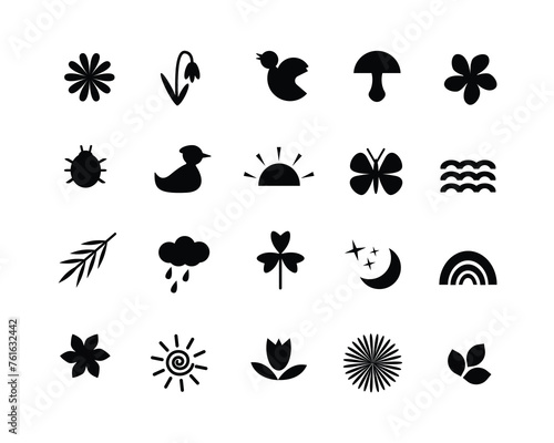 Springtime collection, glyph icons or silhouette illustration set in shades of green, neobrutalism