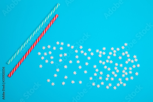 sprinkle in the form of snowflakes and cocktail straws on a blue background