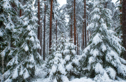 Spruce tree forest covered by fresh snow during winter Christmas time