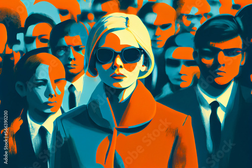 Spy woman. Illegal Mafia and woman as killer concept. AI generative. Character in glasses in crowd of peoples
