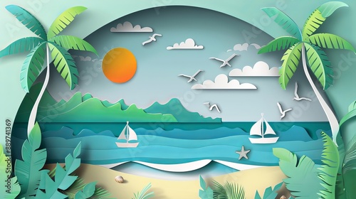 Square box design suitable for placing products in the summer season surrounded by a sea landscape Created in paper cut and craft style