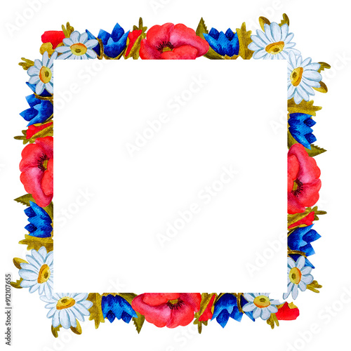 Square frame of wild flowers bluebells and poppies. Hand drawn watercolor illustration.