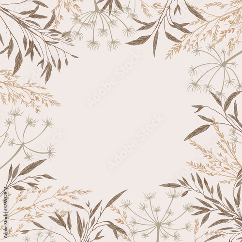 Square frame with plants. Botanical background with dry grass. natural beige tones. Vector illustration. Engraving. Layout border for invitations card, postcards, advertising, logos, covers, labels.