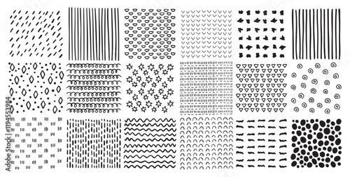 Square patterns set. Hand drawn doodle style patterns. Hatched squares abstract drawing technic, geometric shapes strokes
