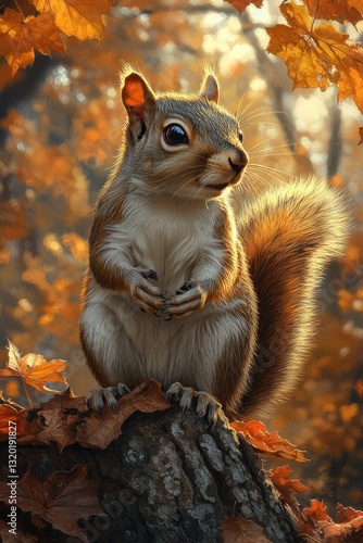 squirrel perched on tree trunk in autumn forest with golden leaves sunny day