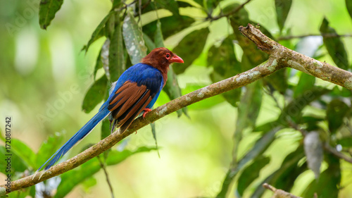 Sri Lanka blue magpie or Ceylon magpie (Urocissa ornata) bird perches on a tree branch at the Sinharaja forest reserve. Endemic bird to Sri Lanka.