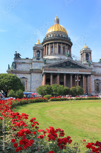 St. Isaac's Cathedral in Saint Petersburg, Russia. Orthodox Church and Museum Building, Famous Cultural Architecture Landmark. Saint Isaac Cathedral Front View with Rose Flowers on Sunny Summer Day