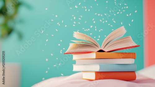 Stack of Books An open book resting on top of a stack of closed books, suggesting a moment of pause in the midst of extensive reading.