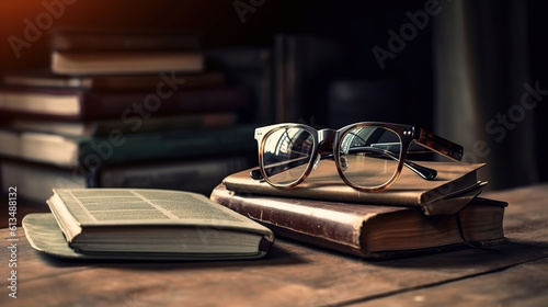 Stack of books with glasses on wooden table in room. Generative Ai