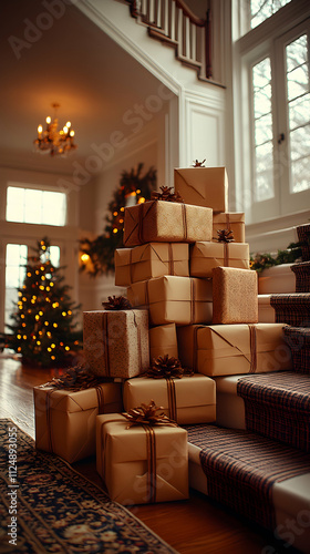 Stack of Christmas gifts on staircase in grand home.