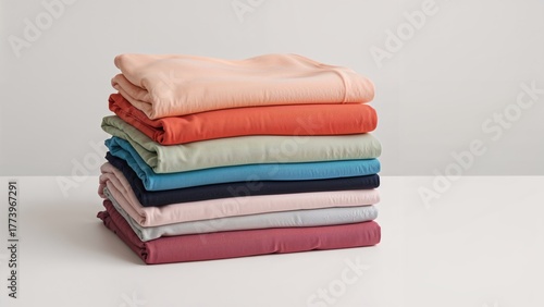 Stack of colorful folded fabrics or clothing arranged on a white surface. The image showcases a variety of colors and soft textures.