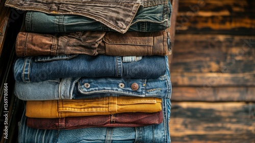 Stack of Folded Jeans and Jackets Against Rustic Wooden Background