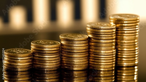 stack of golden coins neatly arranged on a reflective surface, with a growing bar chart in the blurred background. The image symbolizes financial success, investment growth, and economic stability.