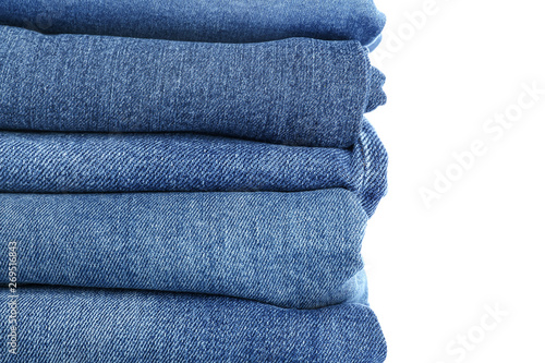 Stack of jeans pants on white background