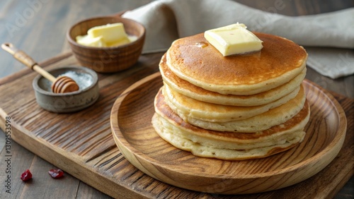Stack of Pancakes with Butter on Wooden Plate, Breakfast, Brunch