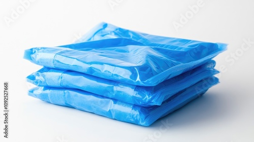 Stack of three blue flow packs of wet wipes neatly isolated on a clean white background, highlighting their glossy packaging and compact design.