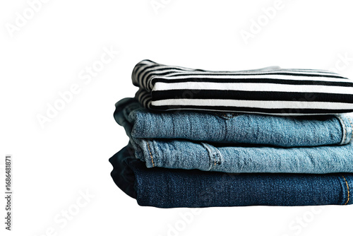 Stacked clothing, a black and white striped top and several pairs of denim jeans