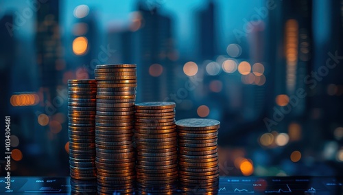 Stacked Coins Against Cityscape Symbolizing Economic Growth