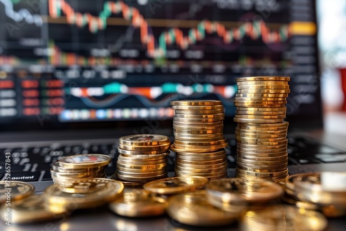 Stacked coins on a financial chart background, symbolizing investment growth, market trends, and economic concepts.