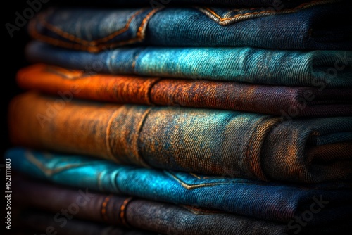 Stacked denim jeans showcasing vibrant colors and textures in a creative arrangement