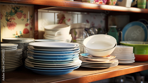 Stacked dishes on wooden shelves.