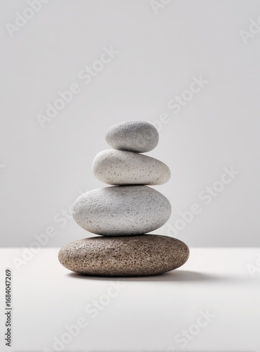 Stacked smooth stones, light gray and beige, on a plain white surface. Simple, balanced, zen-like composition