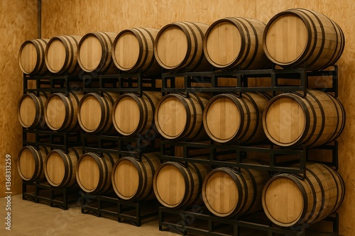 Stacked Wooden Barrels in a Rustic Winery Cellar
