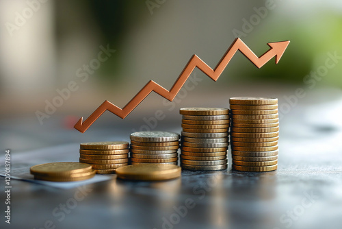 Stacks of coins ascend like a staircase, symbolizing financial growth and progress, guided by an upward-pointing arrow against a blurred, natural backdrop.