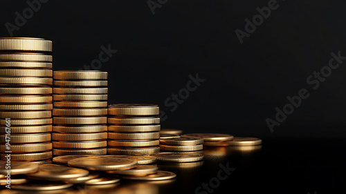 Stacks of gold coins are arranged against dark background, creating striking visual of wealth and prosperity.