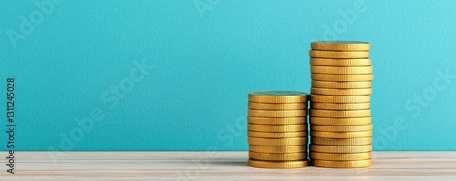 Stacks of golden coins on a teal background symbolizing wealth financial growth savings and investment The image represents the concept of money banking finance and economy