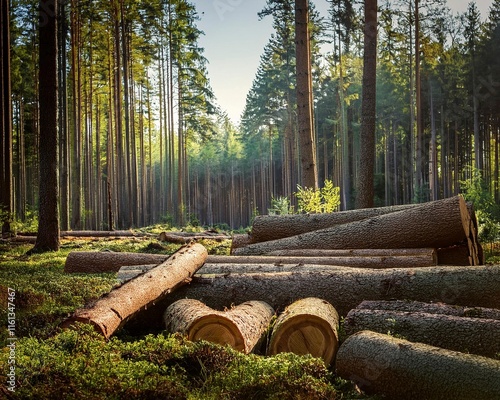 Stacks of large tree logs in a forest clearing under heavy clouds, capturing deforestation and the logging industry's impact on nature.