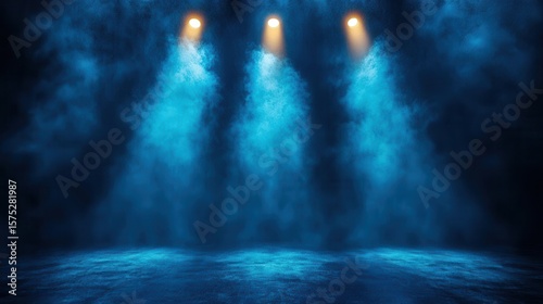 Stage Lighting with Fog and Three Beams Illuminate a Dark Background