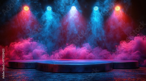 Stage podium background red light spotlight curtain theater show platform. Stage 3D background podium award cinema winner movie carpet pedestal fabric concert abstract studio dark vip empty silk club.