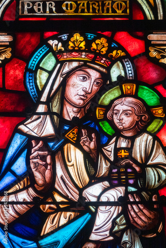 Stained glass (19th century) of Blessed Virgin Mary holding baby Jesus Christ in her arms