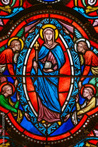 Stained glass (19th century) of Virgin Mary with angels in the heaven.