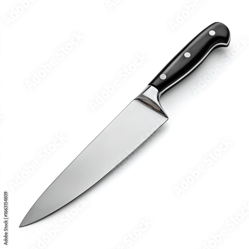 Stainless steel chef knife with black handle on white background