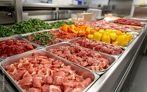 Stainless steel food preparation containers filled with various raw meats, vegetables, and sauces in a commercial kitchen.