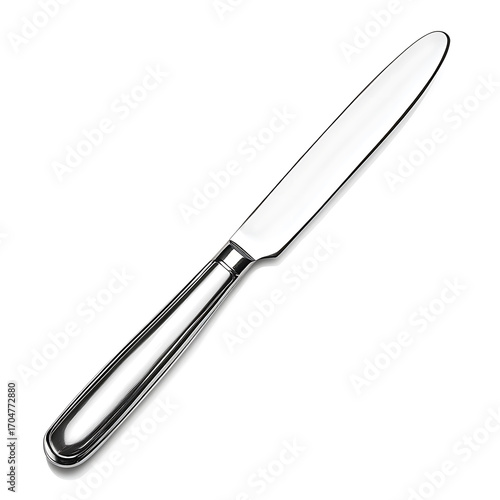 Stainless steel knife with polished handle and sharp blade on white background