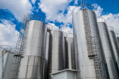 stainless steel tanks at a food processing plant top view
