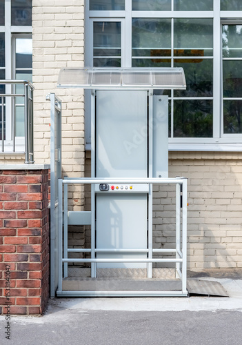 Stair lift for disabled people. Wheelchair lift. A mechanical chair lift that lifts disabled or elderly people up and down.