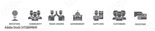 Stakeholder banner web icon illustration concept with icon of community, trade unions, suppliers, and customers icon live stroke and easy to edit