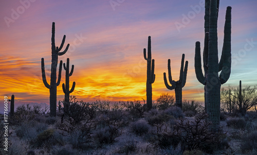 Stand Of Silhouetted Saguaro Cactus At Sunrise Time In Scottsdale Arizona