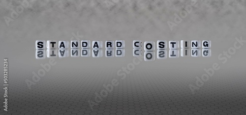standard costing word or concept represented by black and white letter cubes on a grey horizon background stretching to infinity