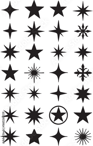 Star silhouette collection with diverse shapes and point styles, black vector icons for design, decoration, and symbols