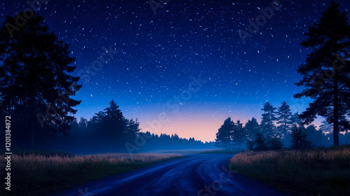 Star Trails over Forest Road at Twilight: Serene Night Landscape