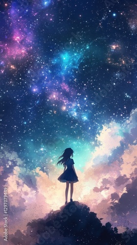 Stargazer's Solitude: A solitary figure gazes up at a breathtaking, star-studded galaxy, evoking wonder and dreams under the infinite expanse of space.