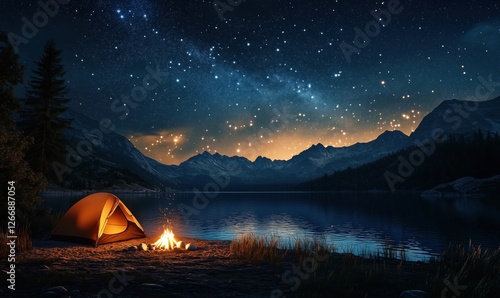 Starlit camping scene by tranquil lake with glowing campfire and majestic mountains