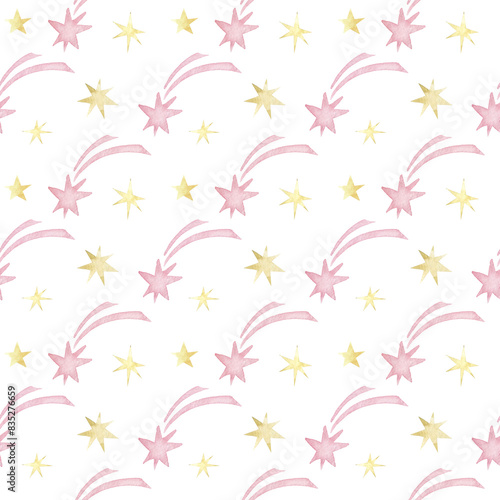 Starry sky.Watercolor hand painted seamless pattern for baby girl.