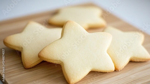 Star-shaped cookies on wooden board, kitchen setting, baking